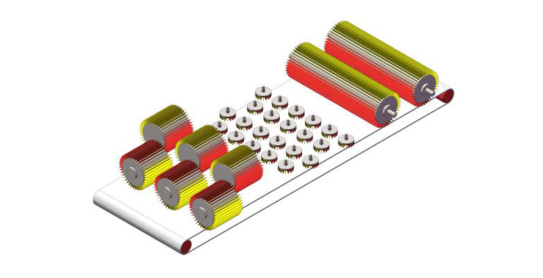 4、2组大砂辊(A)、2组宽幅自转圆盘砂(P)、2组纵向砂辊;
